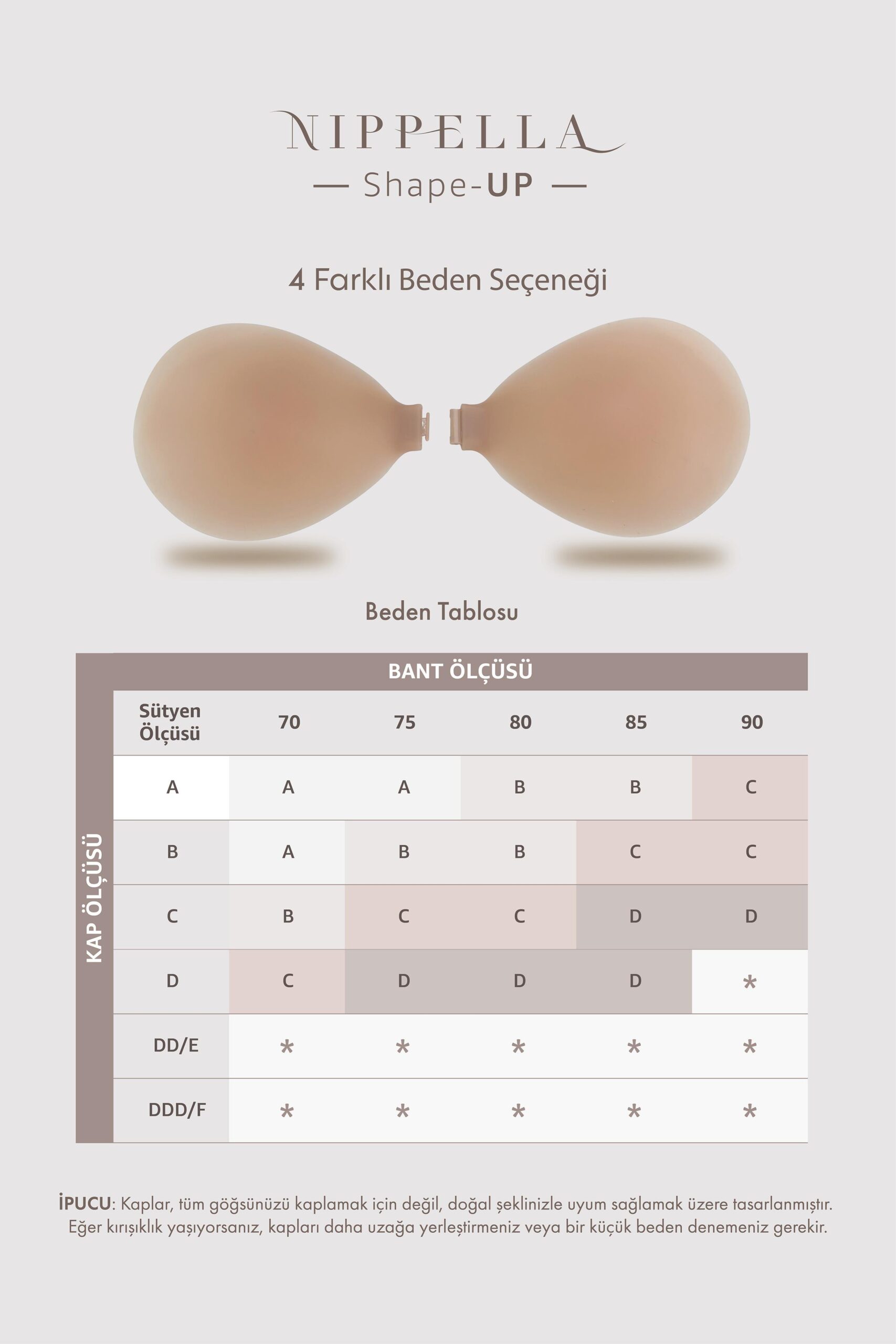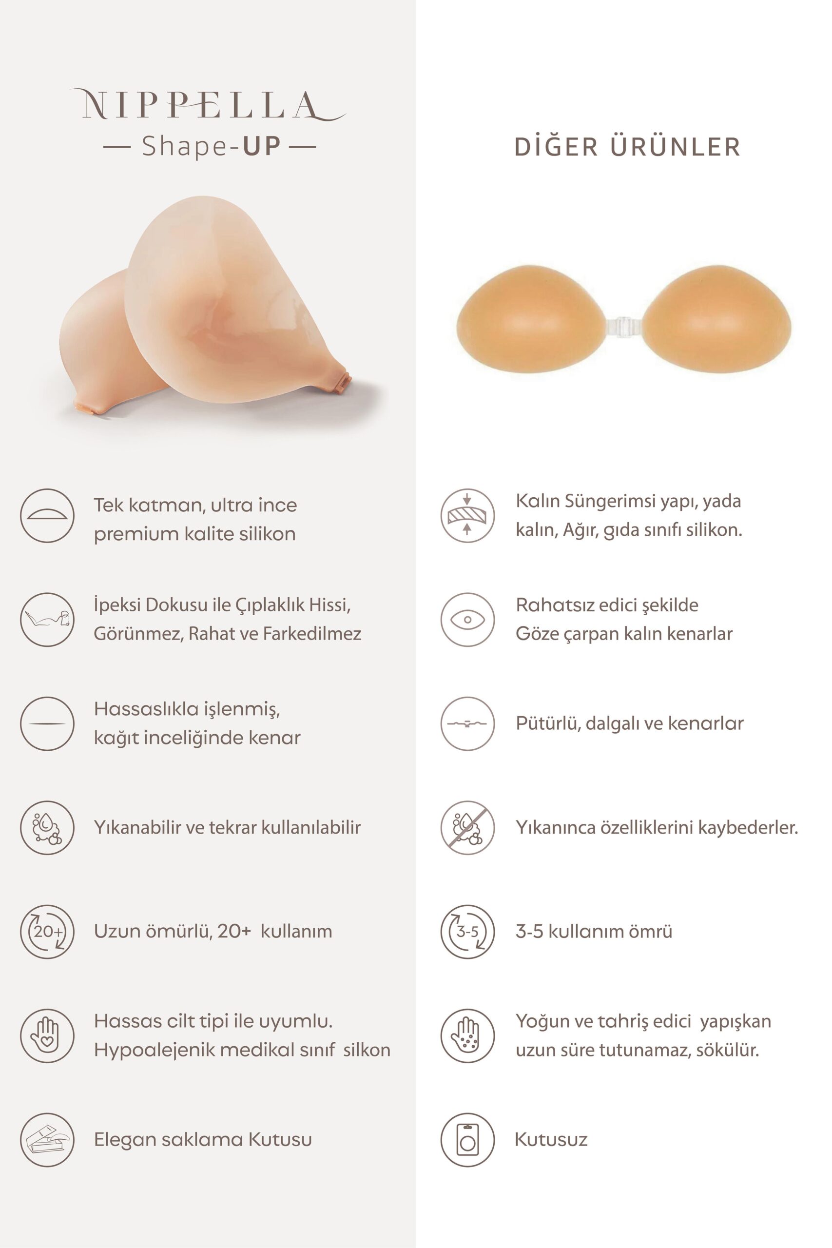 Küçük ve orta boy göğüsler için ideal olan bu yapışkanlı sütyenlerimiz, görünmez kaplama teknolojisi ile tüm gün boyunca güvenli ve konforlu bir kullanım sunarak göğüslerinizi kaldırır, destekler ve dolgun bir dekolte oluşturur. Böylece sırtı açık ve askısız tüm kıyafetlerinizi güvenle giyebilirsiniz ve güzelliğinize mükemmellik katarsınız. NIPPELLA Shape_UP, suya ve tere dayanıklıdır, Yıkandıktan sonra 20’den fazla kez kullanılabilir, kıyafetlerinizde sütyen izi bırakmadan kusursuz bir kapatıcılık sağlayan plastik içermeyen INVISIFEEL™ teknolojisine sahip mat Medikal sınıf silikondan üretilmiştir.
