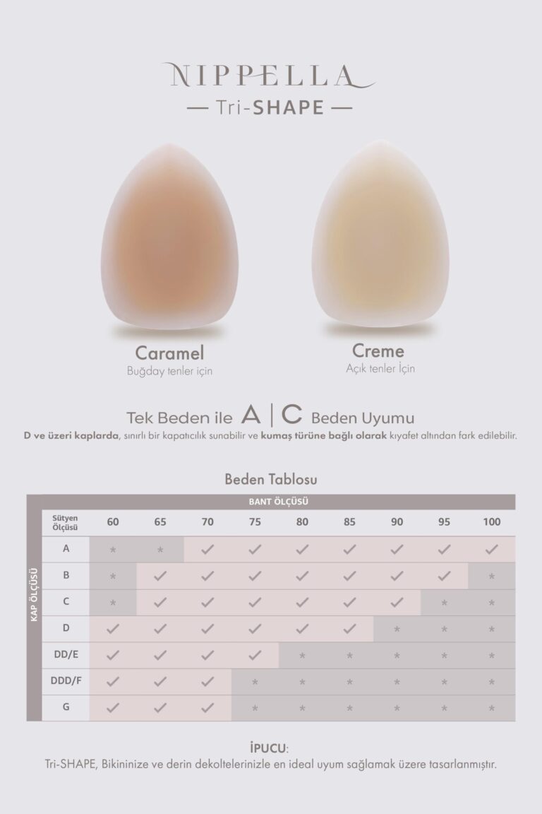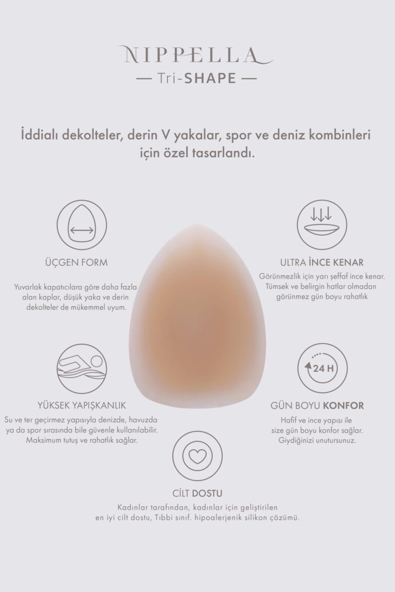 • Nippella Tri-SHAPE silikon üçgen göğüs ucu kapatıcıları, tüm A–C kuplarına uyacak şekilde tek beden olarak tasarlanmıştır.