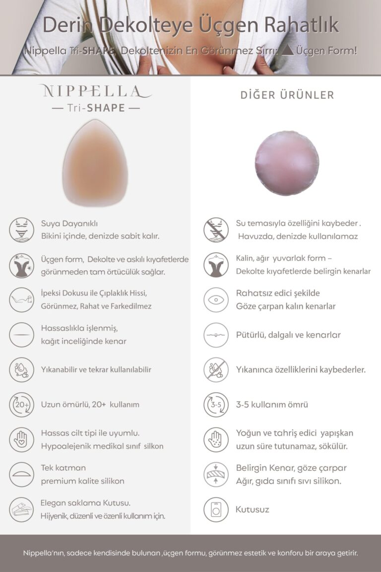 • Nippella Tri-SHAPE hipoalerjenik silikon meme ucu kapatıcıları, cildi tahriş etmeyen yumuşak dokulu medikal sınıf silikon ile üretilmiştir.