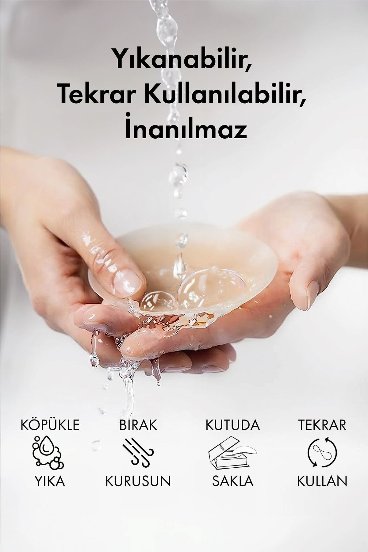 - Giyilipçıkarılması çok kolay, tekrar kullanılabilir yapışkanlı silikon meme ucukapatıcıları, kusursuz ve doğal bir görünüm sağlar.
